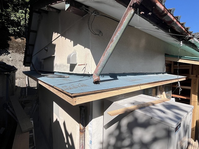 お世話になりました。既存の板金及び、木材の腐食があり解体し新規工事となりました。平の板金でおさめ色は緑青です。壁際をモルタルで補修し完了です。